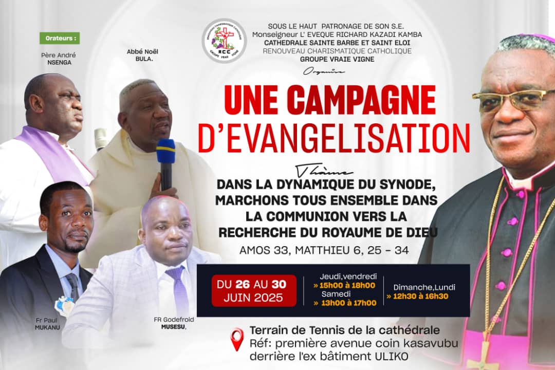 Sous le haut patronage de Son Excellence Monseigneur Richard Kazadi Kamba, évêque du diocèse de Kolwezi, le Renouveau Charismatique Catholique (RCC), groupe Vraie Vigne, a lancé ce jeudi 26 juin 2025 une grande campagne d’évangélisation sur le terrain de tennis de la cathédrale.