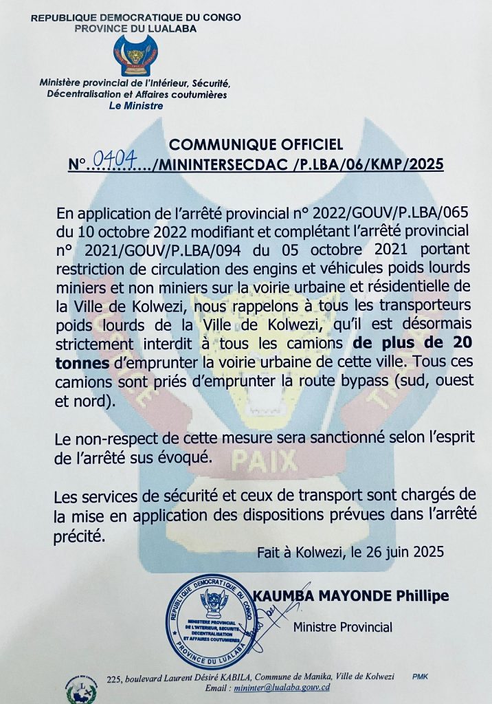À Kolwezi, les autorités provinciales haussent le ton : les camions de plus de 20 tonnes sont désormais interdits d’accès à la voirie urbaine. Une mesure musclée, prise pour protéger les infrastructures routières et réorganiser le flux de circulation dans une ville saturée par le passage quotidien des mastodontes miniers.