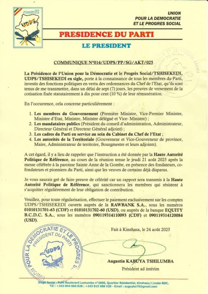 Le document, signé par Augustin Kabuya Tshilumba, président ad intérim de l’UDPS, précise que les concernés disposent d’un délai de sept jours pour transmettre les preuves de paiement.