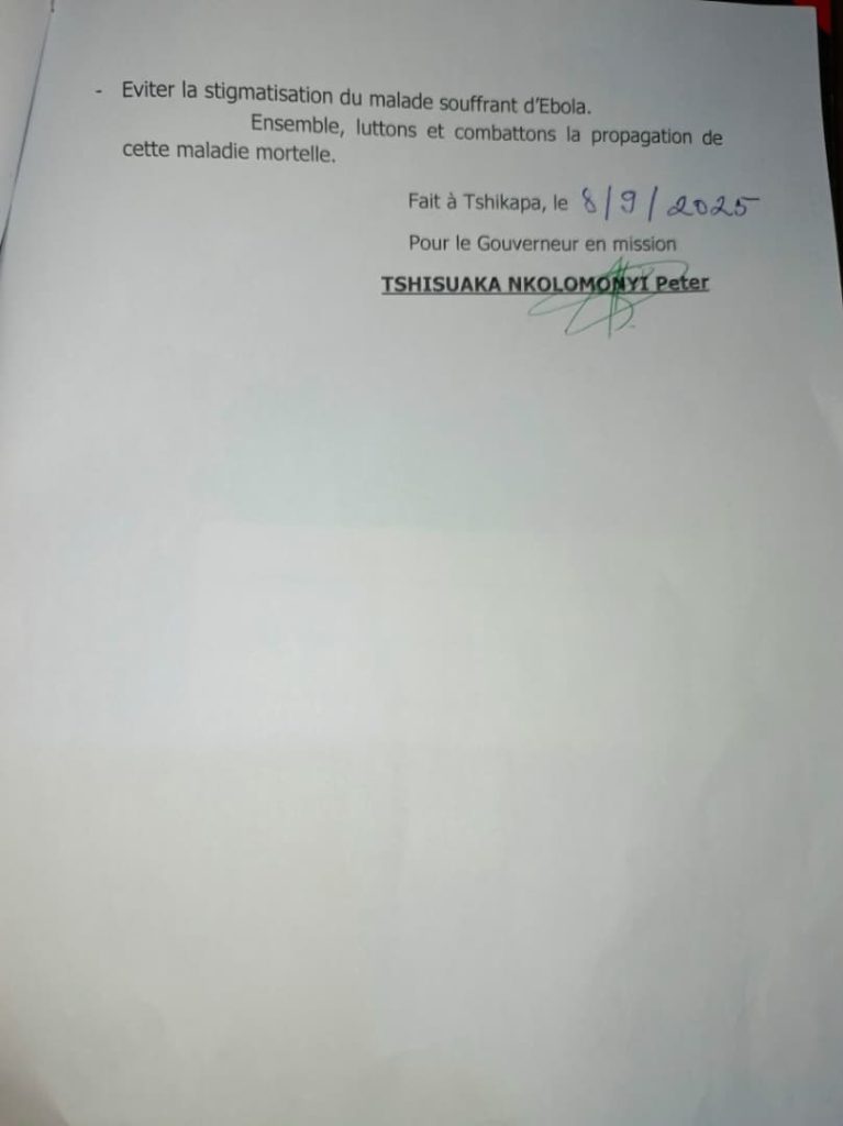 Dans le territoire de Mweka, la zone de santé de Bulape est placée en confinement après la résurgence de la maladie à virus Ebola. Le gouvernement provincial du Kasaï a annoncé ce lundi le renforcement des contrôles sanitaires, avec trois postes érigés aux principales entrées de la ville et deux barrières supplémentaires sur les ponts Tshimbinda et Luenda, axes stratégiques vers Tshikapa.