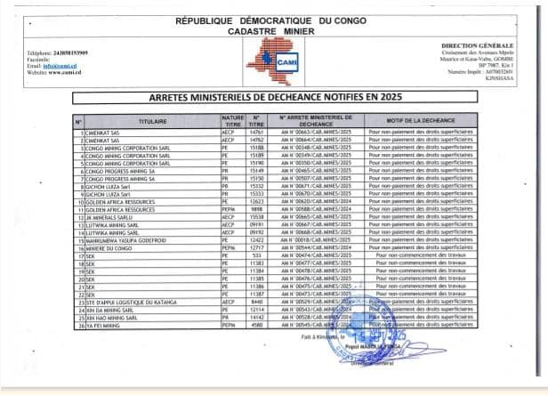 Le Cadastre minier (CAMI) vient de publier pour l’année 2025 une liste consolidée des arrêtés ministériels prononçant la déchéance de sociétés de leurs droits miniers ou de carrières, pour manquements à leurs obligations administratives.