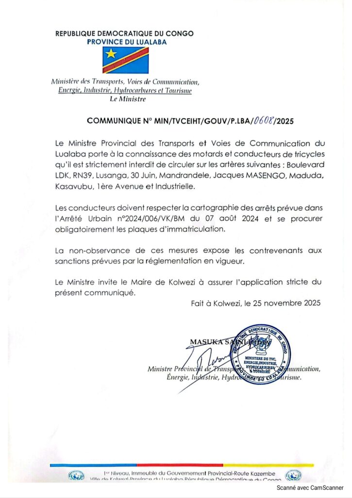 Le gouvernement provincial du Lualaba resserre la vis. Dans un communiqué publié le 25 novembre 2025, le ministre provincial des Transports et Voies de Communication annonce l’interdiction formelle des motos et tricycles sur plusieurs axes stratégiques de Kolwezi.