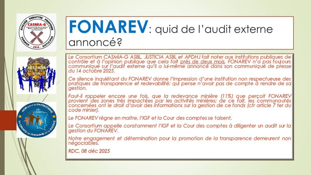 Pour les organisations signataires, ce silence prolongé entretient des zones d’ombre et alimente les inquiétudes autour de la gestion de cette structure publique. Elles estiment que l’opacité actuelle va à l’encontre des principes de transparence et de redevabilité, alors même que le FONAREV administre des fonds provenant de la redevance minière de 1 %, prélevée dans des zones particulièrement touchées par l’activité extractive.