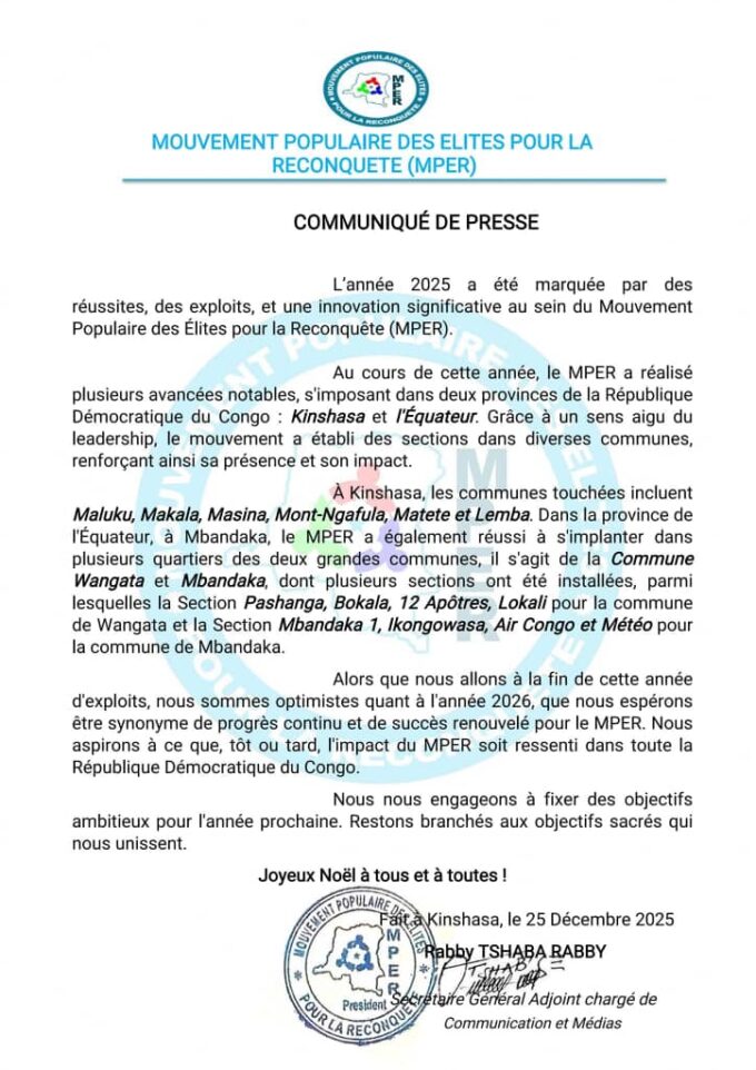 Byredactiondécembre 25, 2025Le Mouvement Populaire des Élites pour la Reconquête (MPER) dresse un bilan largement positif de l’année 2025, marquée par des avancées organisationnelles majeures...