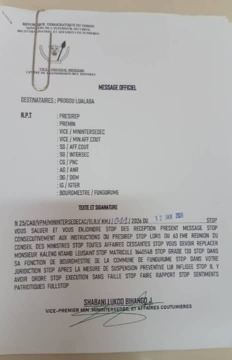 Dans un message officiel signé par le Vice-Premier ministre de l’Intérieur, Sécurité, Décentralisation et Affaires coutumières, Shabani Lukoo Bihango, les autorités centrales ordonnent la réintégration Kaleng Ntamb Lussaint dans ses fonctions, conformément aux instructions du Président de la République, issues de la 63ᵉ réunion du Conseil des ministres.