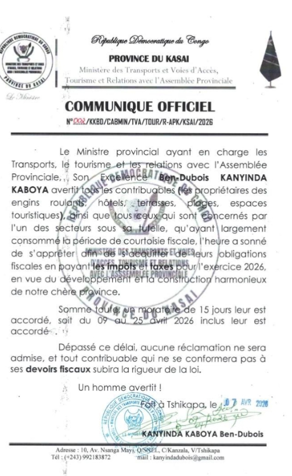 Selon une correspondance officielle consultée mercredi, ce délai court du 09 au 25 avril 2026 inclus et concerne notamment les propriétaires d’engins roulants, les exploitants d’hôtels, de terrasses, de plages ainsi que d’espaces touristiques à Tshikapa, chef-lieu de la province du Kasaï.